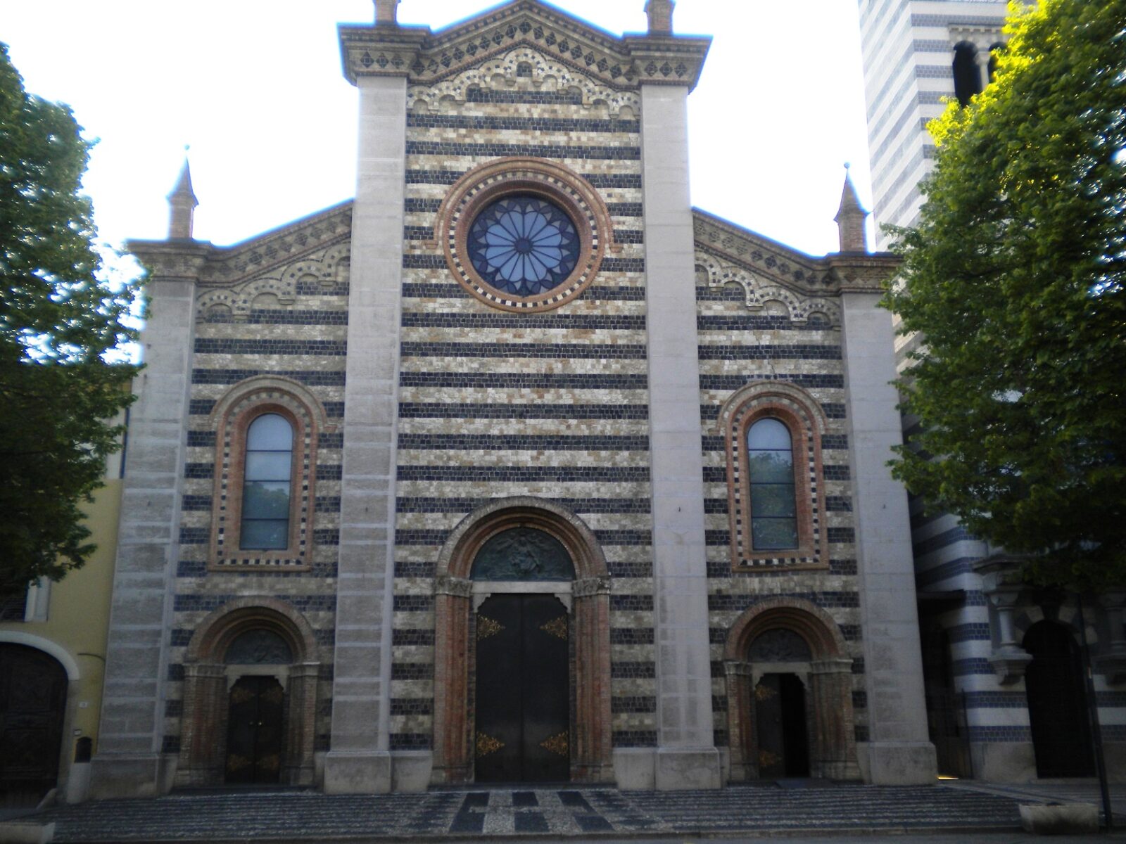 L’edificio, progettato da Guglielmo della Cella, è in stile neo romanico e presenta una facciata a strisce a contrasto realizzata in sassi bianchi e neri.