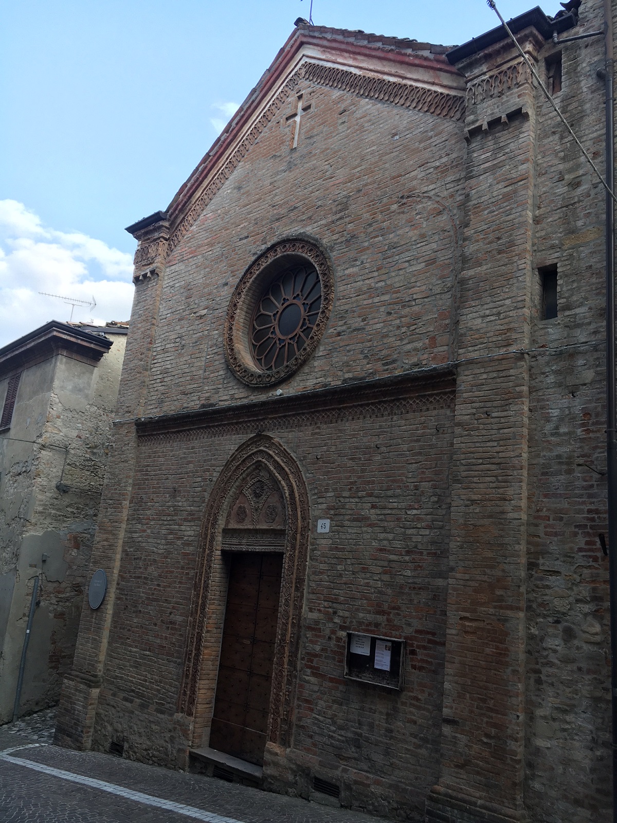 Una fascia di archetti in laterizio divide la facciata orizzontalmente: al di sopra si trova un rosone sormontato a sua volta da una piccola apertura cruciforme; al di sotto c’è la bella porta, ad arco ogivale, circondata da una cornice in cotto.