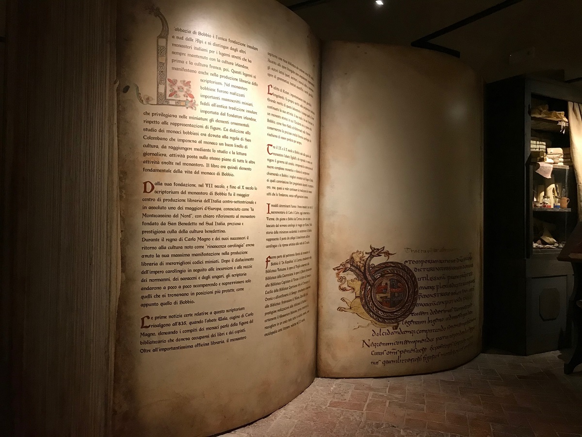 Le diverse sezioni affrontano le tematiche legate alla vita e opere di San Colombano, dal preludio irlandese al suo arrivo a Bobbio, la situazione geo-politica dell’Italia longobarda e l’attività dello Scriptorium. L’allestimento costituito da espositori leggeri e trasparenti in cui sono ordinati testi e illustrazioni è correlato da supporti informatici. Il primo programma interattivo è una sorta di lezione di paleografia con la riproduzione di pagine di alcuni codici (15) redatti a Bobbio ma oggi custoditi alla Biblioteca Ambrosiana di Milano, databili tra il IX e XII secolo.