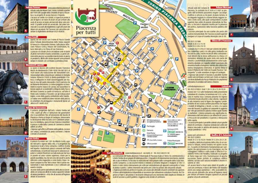 La mappa presenta un percorso agevolato che tocca alcuni dei principali luoghi da non perdere nel centro storico di Piacenza. Si sono scelti monumenti raggiungibili a piedi su una distanza di 1 chilometro, in aree pedonali e a traffico limitato, dove non esistono percorsi protetti, ma il limitato flusso veicolare consente di muoversi con minor pericolo.