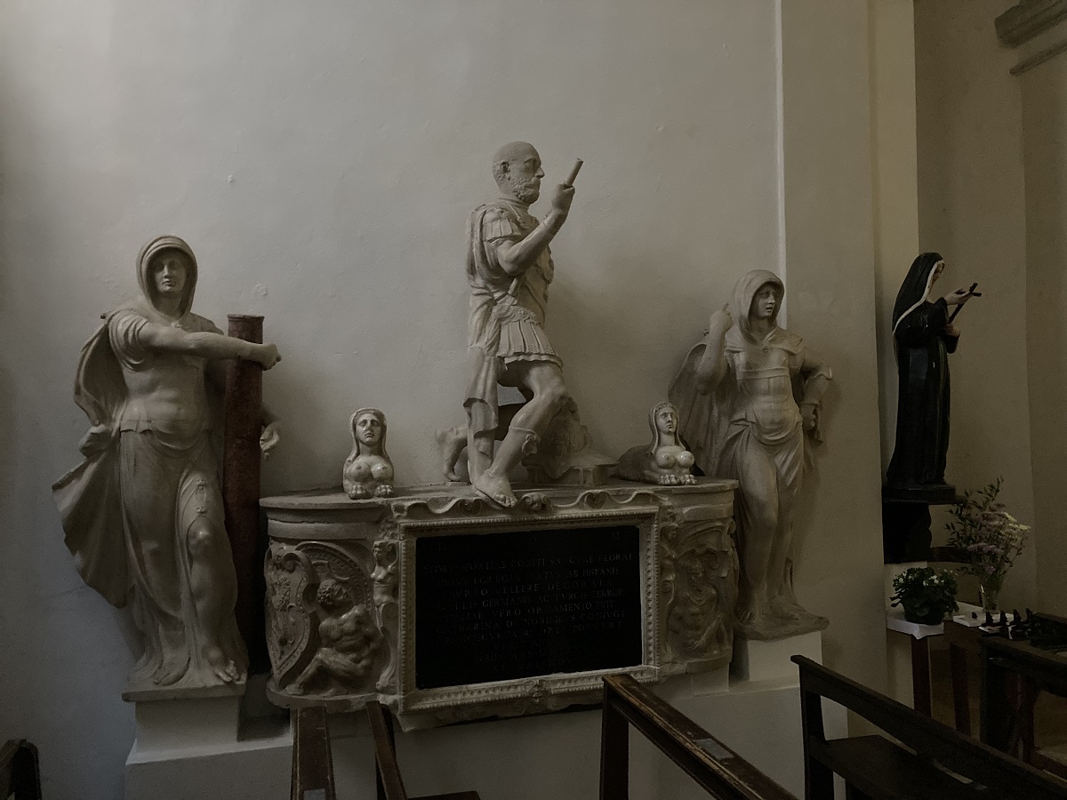 The monument, which was reassembled after having been forgotten for a long time, lost some sculptured parts; it represets Count Sforza kneeling and wearing “Roman” clothes; he’s surrounded by statues of Prudence and Fortitude. The sarcophagus, composed of a slab of black marble and two reliefs, is supported by two Greek sphinxes.