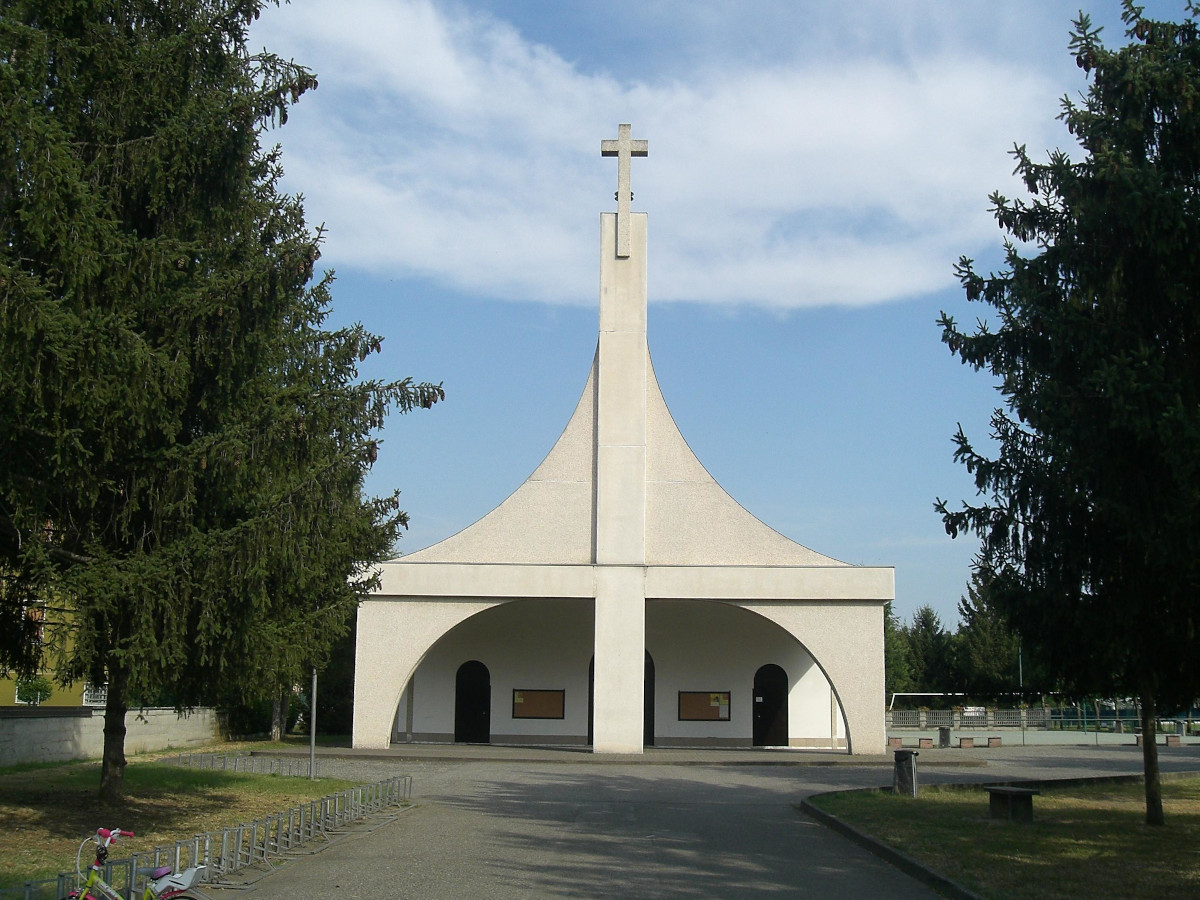 San Corrado Confalonieri vicarage was born in 1973 Duemila district as episcopal delegation;construction began in November 1974 and finished in a few months. It is a simple building since the community tends to privilege pastoral structures. The vicarage was officially born on 4th November 1976. In 1986 extension works started and the external architecture changed: front portico with a stele ending in a cross; the side walls are characterised by arches. The plan is rectangular, the space inside linear and functional. In 1988 the floor was renovated and the presbyterium was raised in height and outlined by sculptures. The church was consecrated on 19 February 1989. It was designed by the architect Paolo Cravedi. Inside there are works by contemporary artists: Presbyterium and Via Crucis Staues by Paolo Perotti, a crucifix by Ada Tassi and several paintings: two stories of S. Corrado (The fire and The Glory) by Bruno Grassi, a Bread Miracle by Franco Curatti, a San Corrado by Angelo Prazzoli.