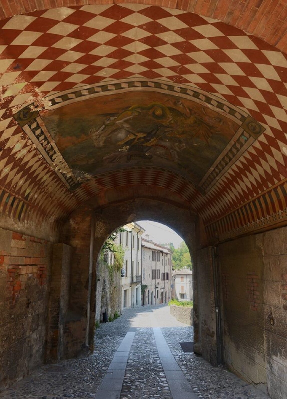 Stradivari Palace vaulting is a veritable gate giving access to the upper part of the village of Castell’Arquato. Its completely decorated, both on the perimetral walls and on the intrados where, surrounded by geometrical decorations, St. George and the dragon are represented.