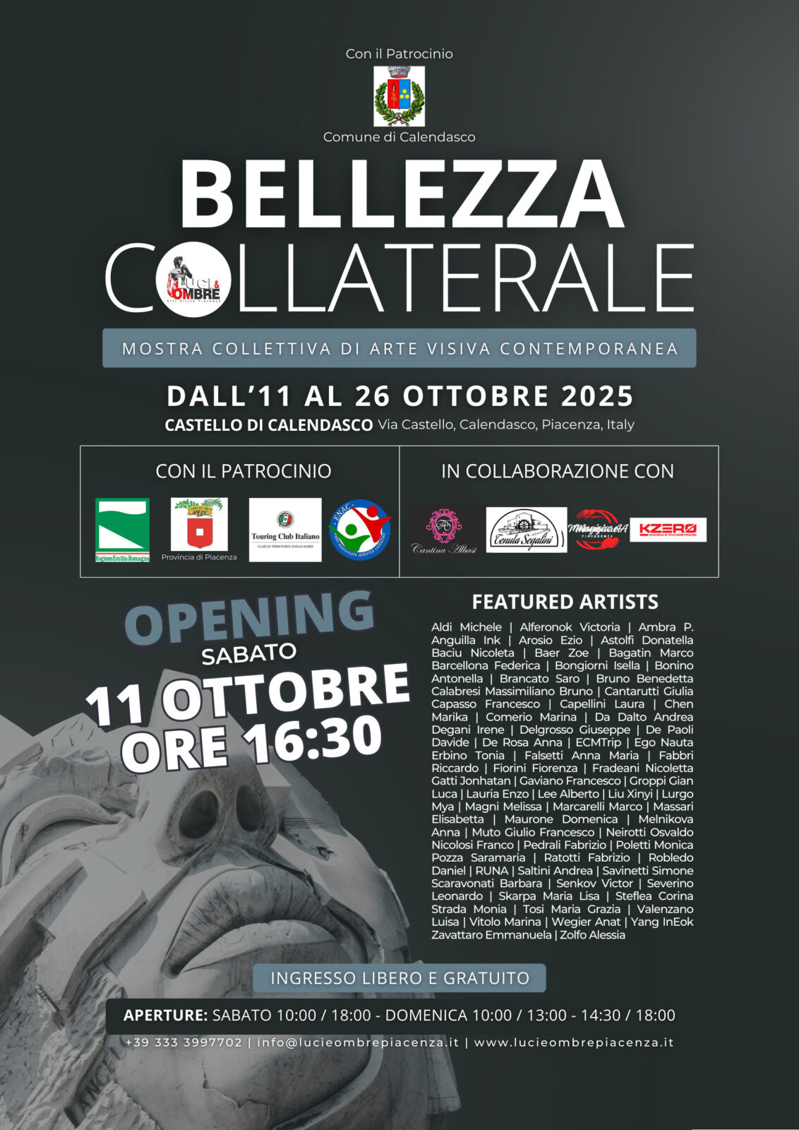 All’interno delle mura del Castello di Calendasco, risalente all’XII secolo, “Bellezza Collaterale” è una mostra collettiva che riunisce linguaggi molteplici – fotografia, pittura, scultura, installazione, video art, mixed media, disegno, arte digitale e gioiello contemporaneo – attraverso più di 150 opere di sessantotto artisti provenienti da Italia, Portogallo, Regno Unito, Bielorussia, Svizzera, Polonia, Moldavia, Corea del Sud e Cina.