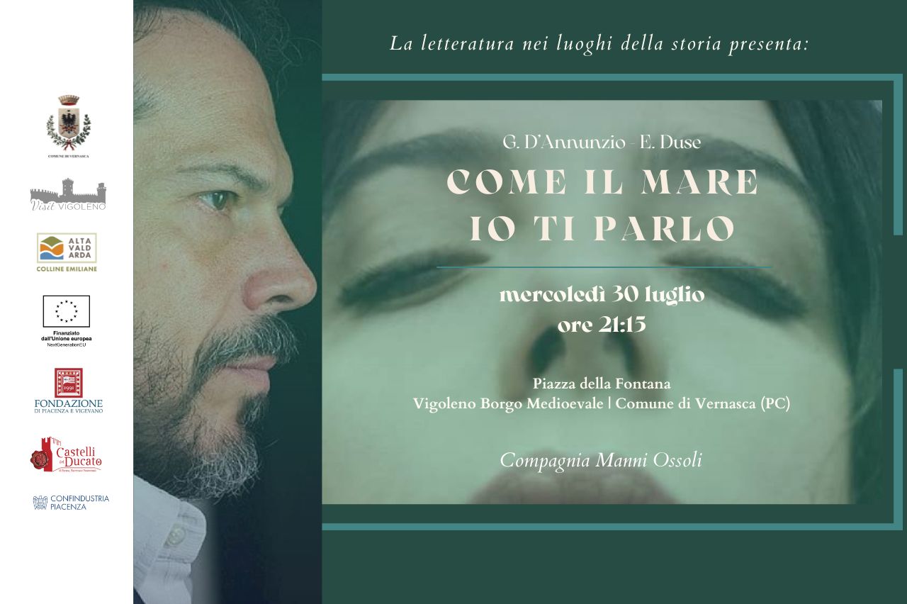 La compagnia teatrale di Mino Manni e Marta Ossoli propone un recital con brani e lettere private scambiate fra Gabriele d’Annunzio ed Eleonora Duse. Verrà messo in scena anche un atto unico scritto appositamente dal poeta per la sua musa, intitolato “Sogno di un mattino di primavera”. Ad accompagnare i due attori, il duo di archi di Silvia Mangiarotti (violino) e Francesca Ruffilli (violoncello).