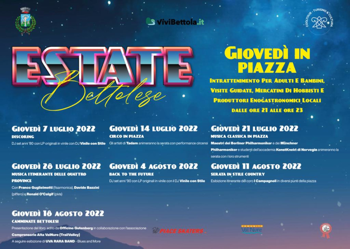 Estate Bettolese. A Bettola animazione in Piazza Colombo per tutti i giovedì estivi e nei weekend.