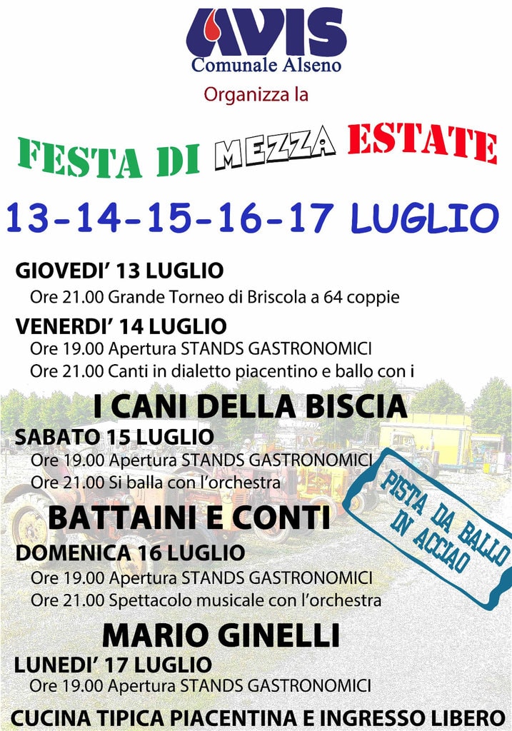 La sezione AVIS del Comune di Alseno organizza la Festa di Mezza Estate dal 13 al 17 luglio 2023