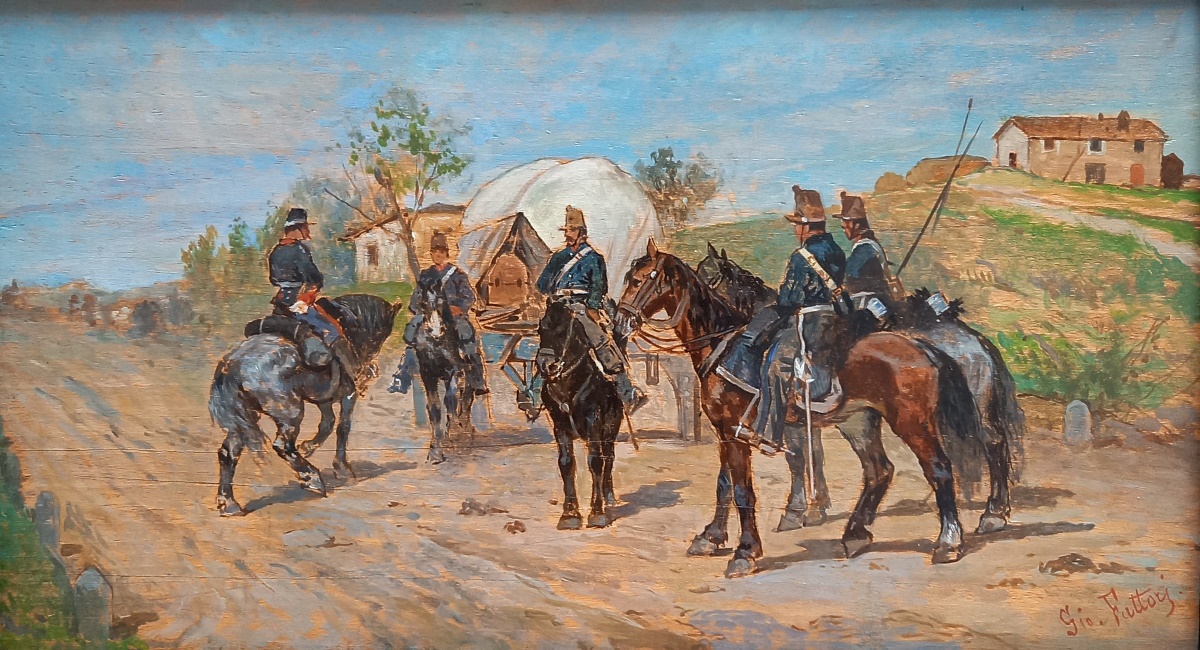 Giovanni Fattori (Livorno 1825 – Firenze 1908), protagonista indiscusso del movimento dei Macchiaioli, ha indagato e ha saputo dominare tutti i generi pittorici. Le prime ricerche sulla macchia, condurranno ad una vera e propria rivoluzione nel panorama artistico ottocentesco, ma ad esse si accostano ricerche sul ritratto, sul paesaggio nell’accezione en plein air, sulla vita rurale, nonché sulla Maremma, simbolo di quel mondo contadino che Fattori amava e che contrapponeva alla disorientante modernità urbana. Su questi campeggiano i soggetti militari, indagati sia nelle manifestazioni più solenni ed epiche delle grandi campagne delle Guerre d’Indipendenza, sia nei momenti più intimi della vita di guarnigione.