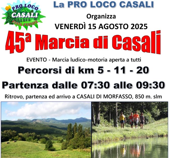 Una marcia ludico-motoria, inserita nel calendario nazionale degli eventi FIASP, con partenza e arrivo ai Casali di Morfasso, fra le montagne dell’Alta Val d’Arda. Tre percorsi ad anello di 5, 10 o 20 km, adatti a tutti gli appassionati più o meno esperti. Le iscrizioni si effettuano direttamente alla partenza, dalle ore 7.30 alle 9.30. Contributo di partecipazione: 3,50 € (3,00 € per i soci FIASP).