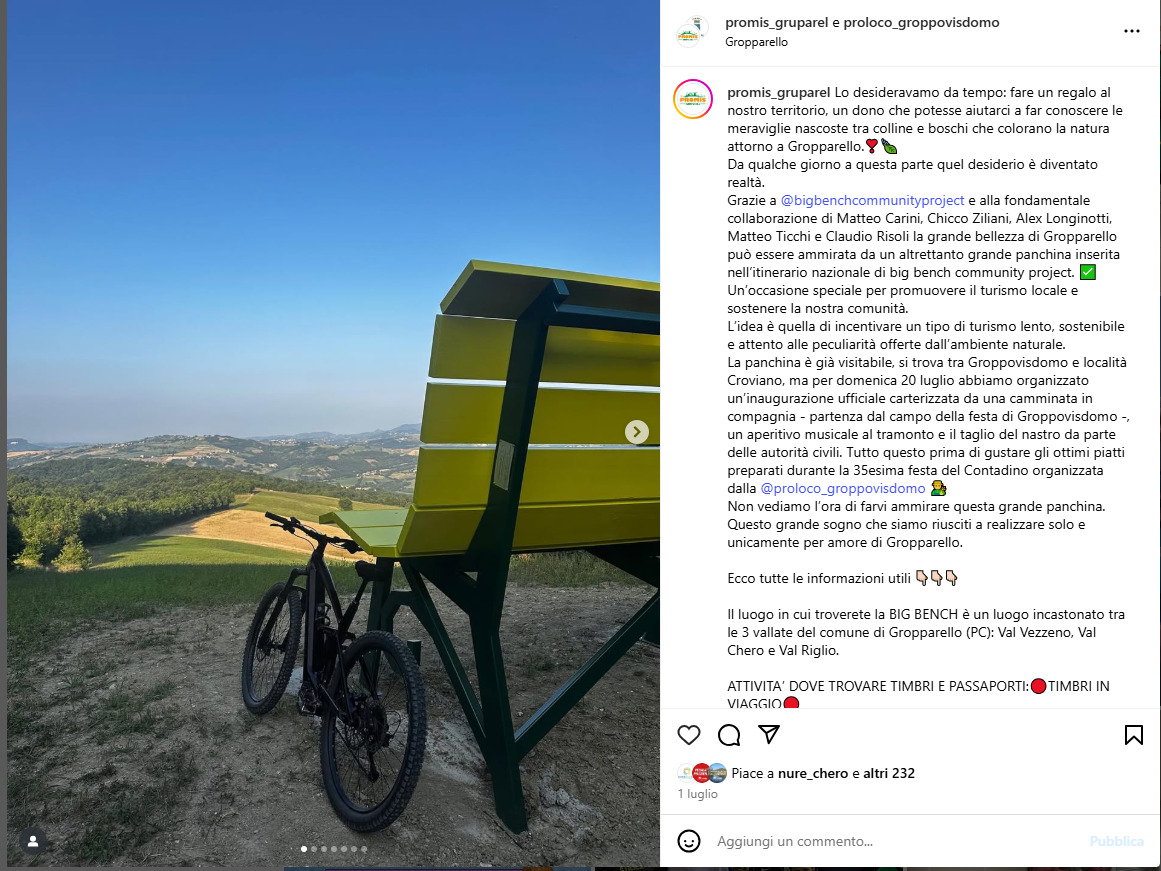 La Val Nure Chero si arricchisce della terza panchina gigante dopo quelle di Villò e Veano. Questa Volta si sale fino a Groppovisdomo per raggiungere una panca di colore giallo che offre una vista davvero eccezionale sulla vallata sottostante.